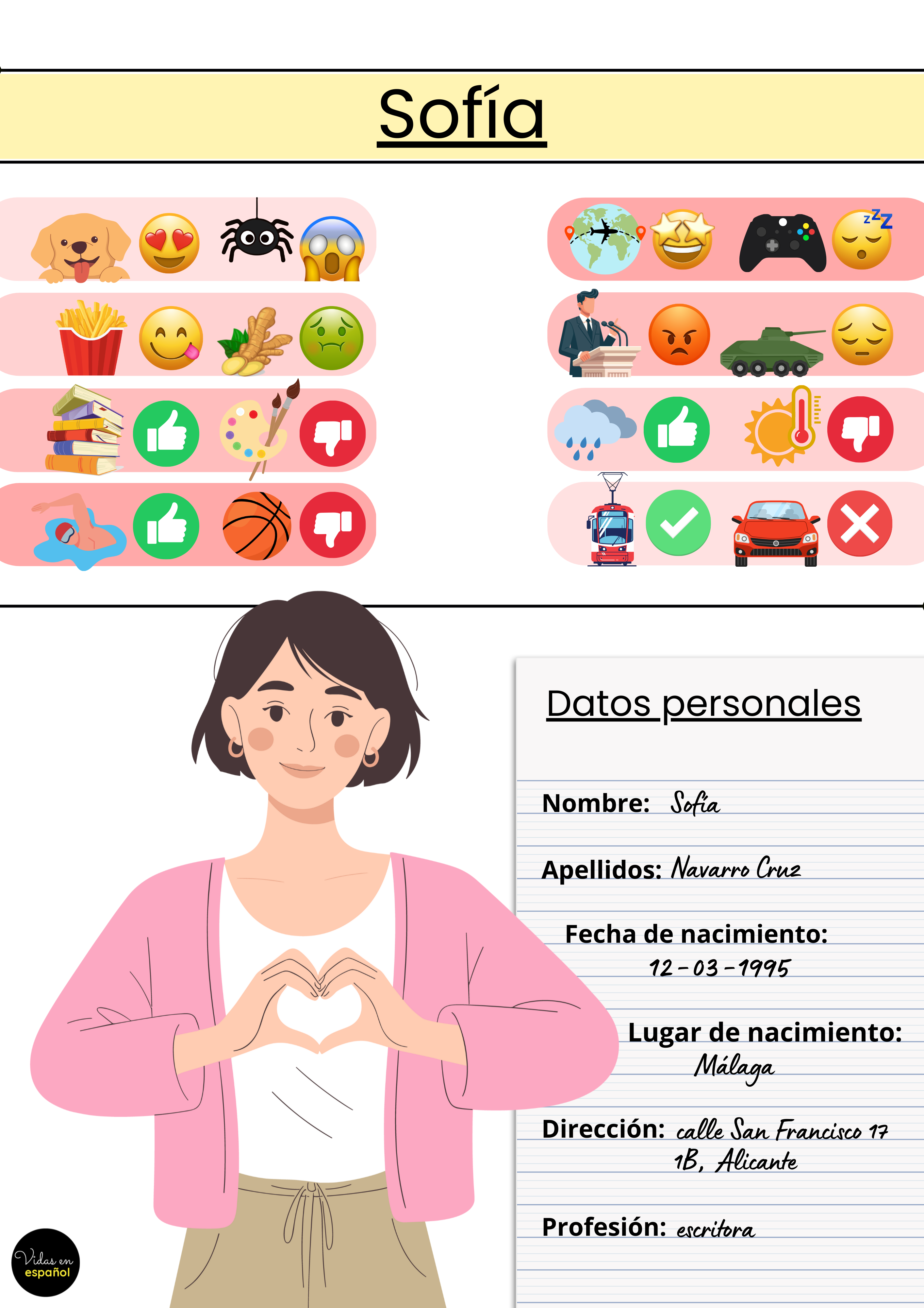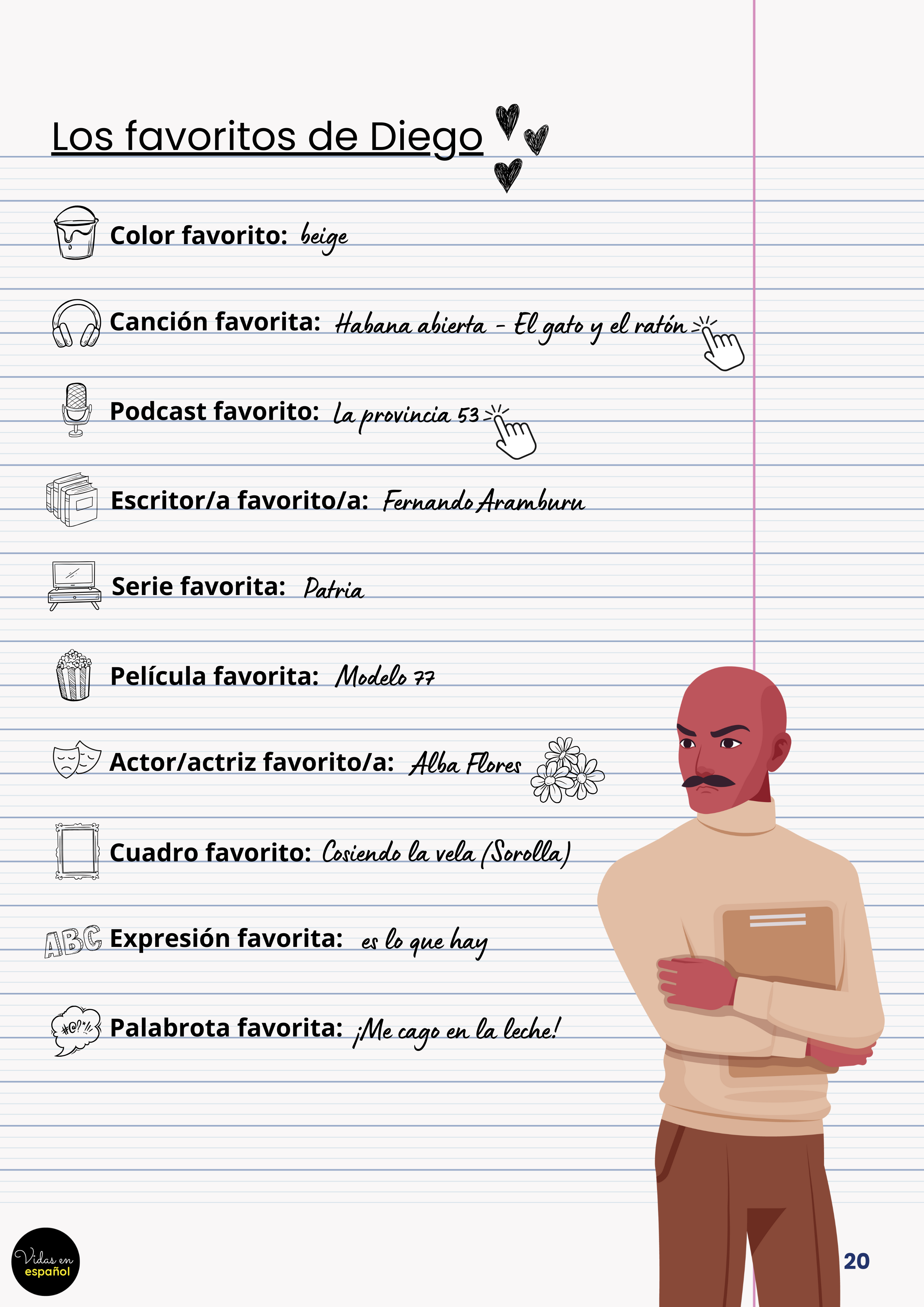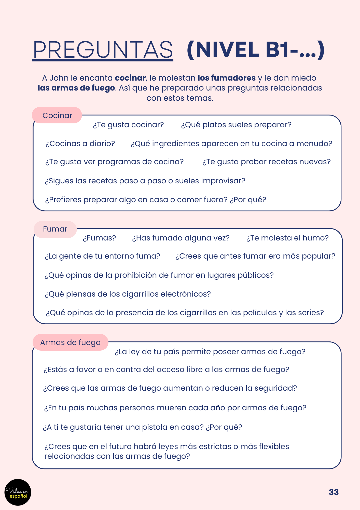 – preguntas de nivel más avanzado (B1-…) relacionadas de alguna manera con las personas de las hojas y sus preferencias (hablarás de los temas como: comida rápida, redes sociales, armas de fuego, cotillear, fumar, viajar en avión, vegetarianismo o tareas domésticas)