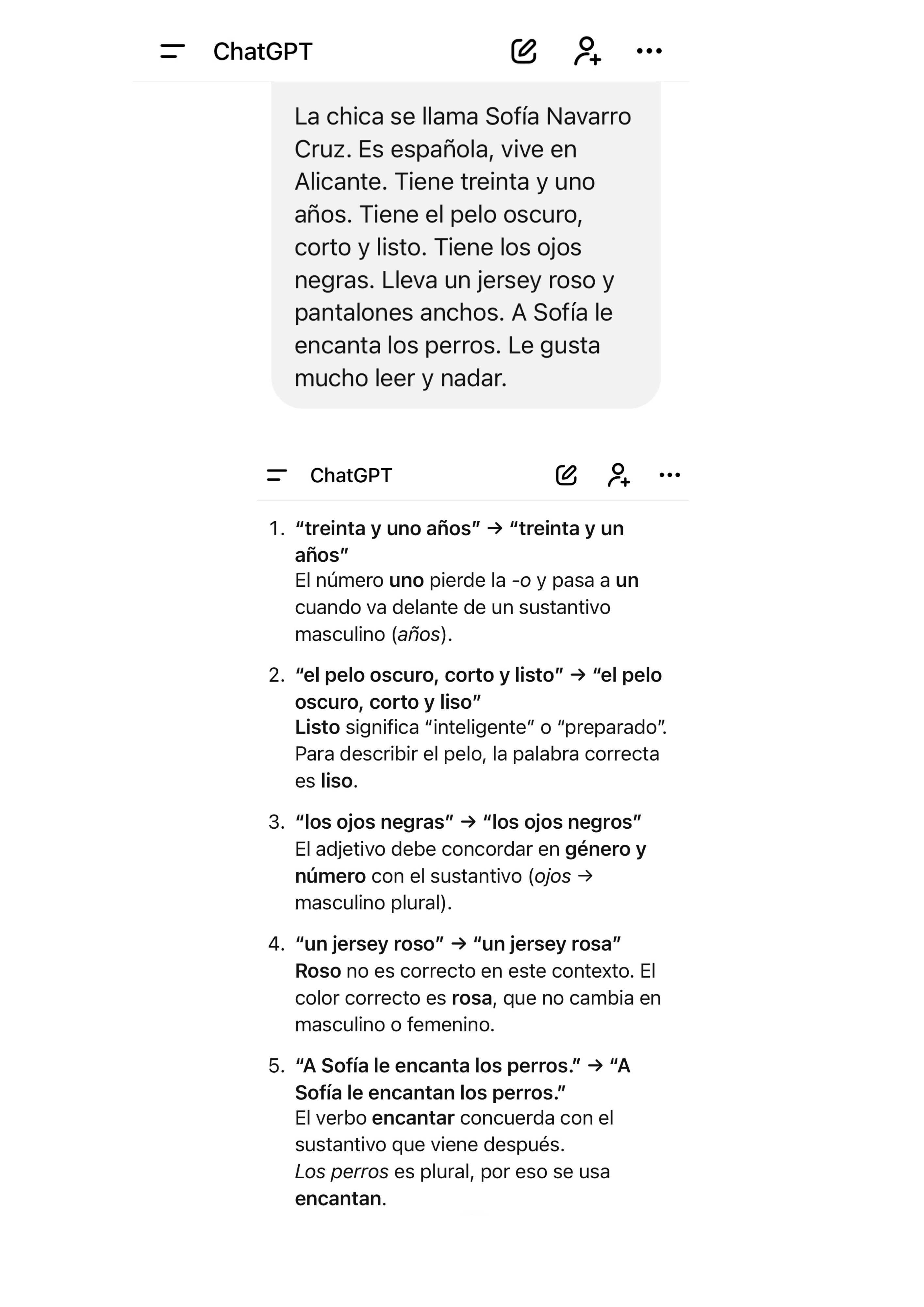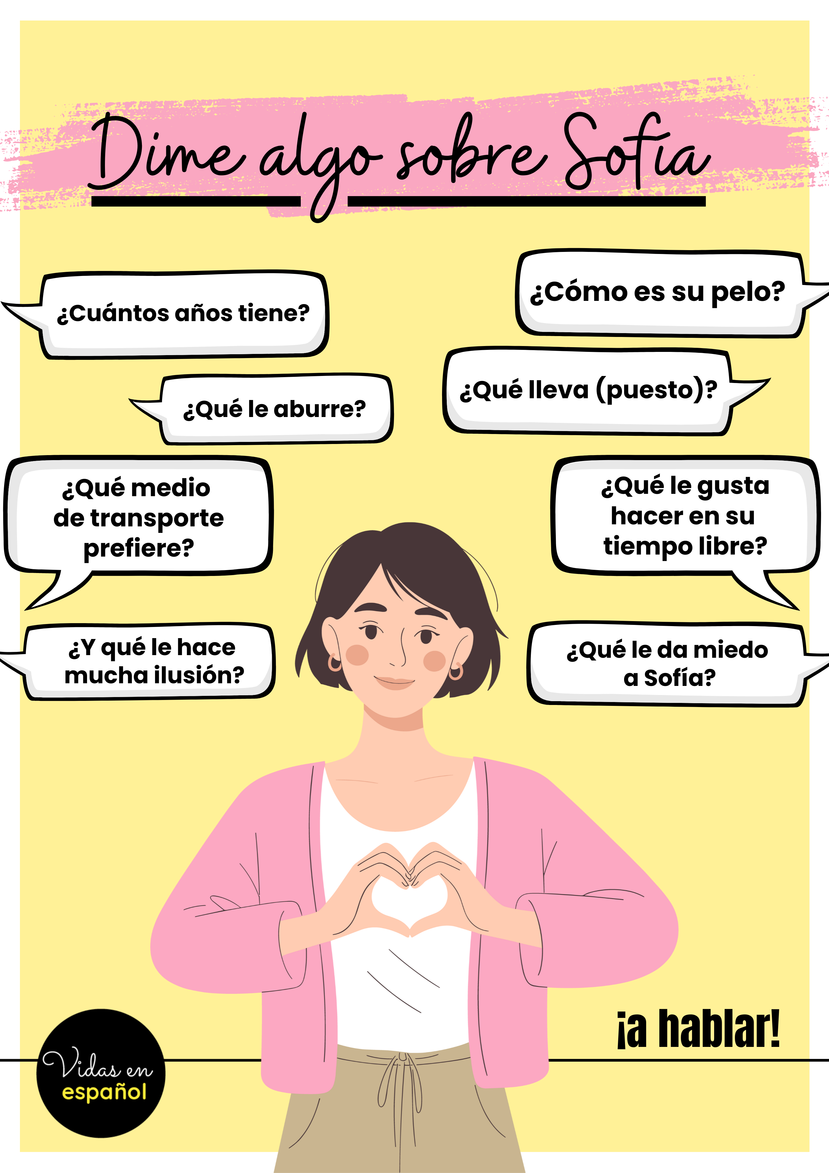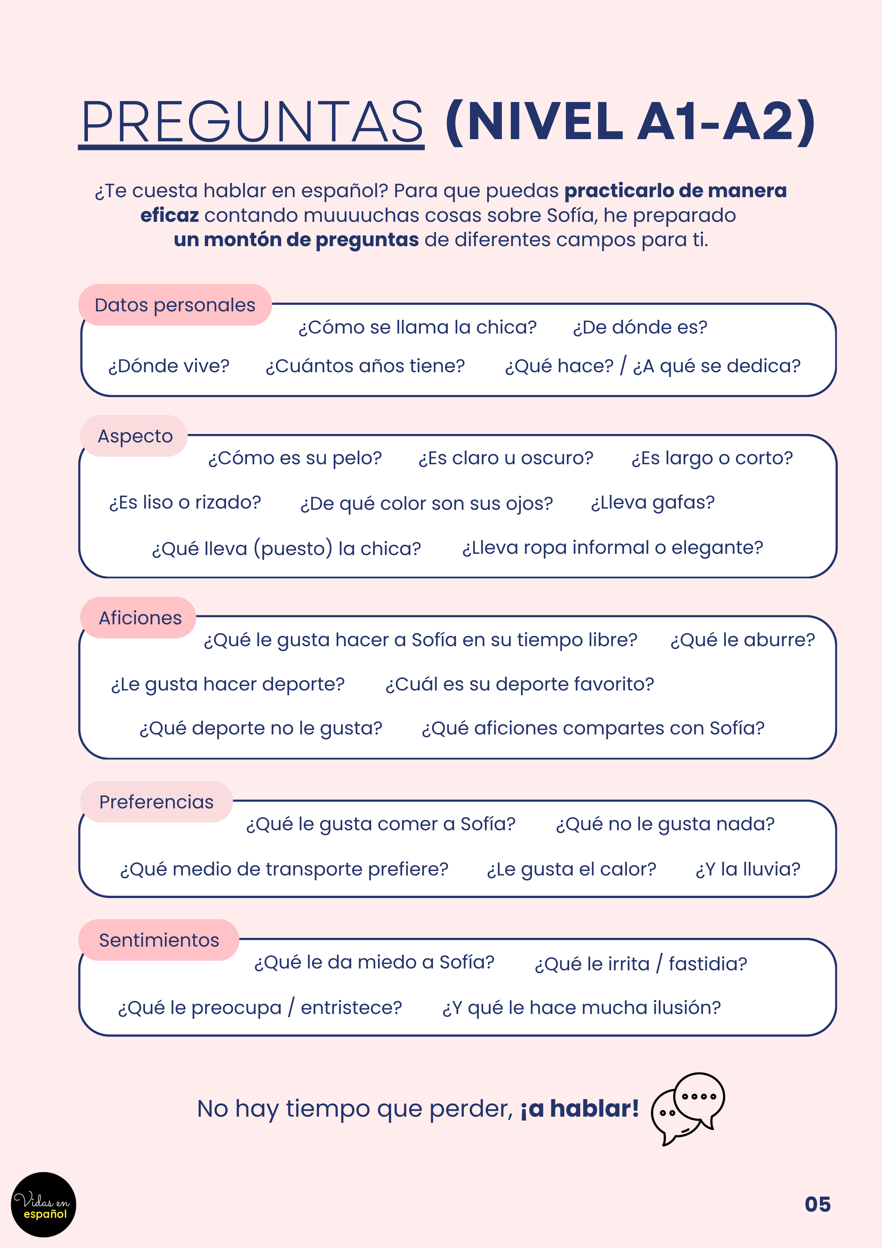 – preguntas de nivel A1-A2 (relacionadas con las personas de las hojas e información sobre ellas, su aspecto físico, su ropa, sus aficiones y preferencias) + respuestas